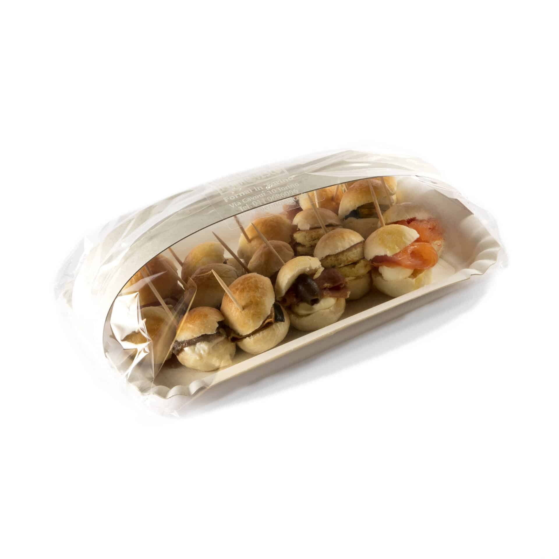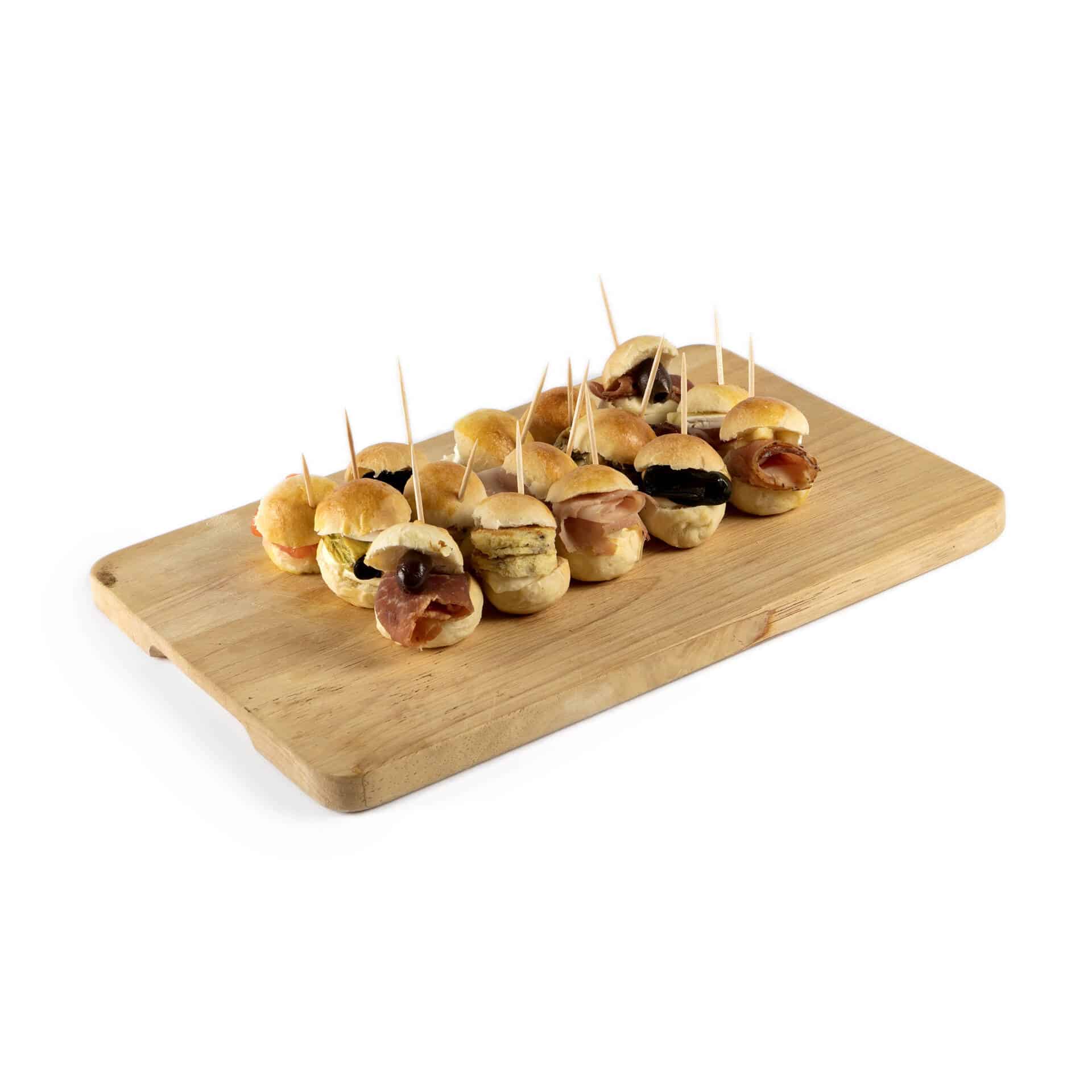 Mini paninetti farciti con prosciutto cotto e maionese, melanzane olive e pesto di basilico e anacardi, peperoni e acciughe, mortadella e maionese (Vassoio da 16 pezzi)