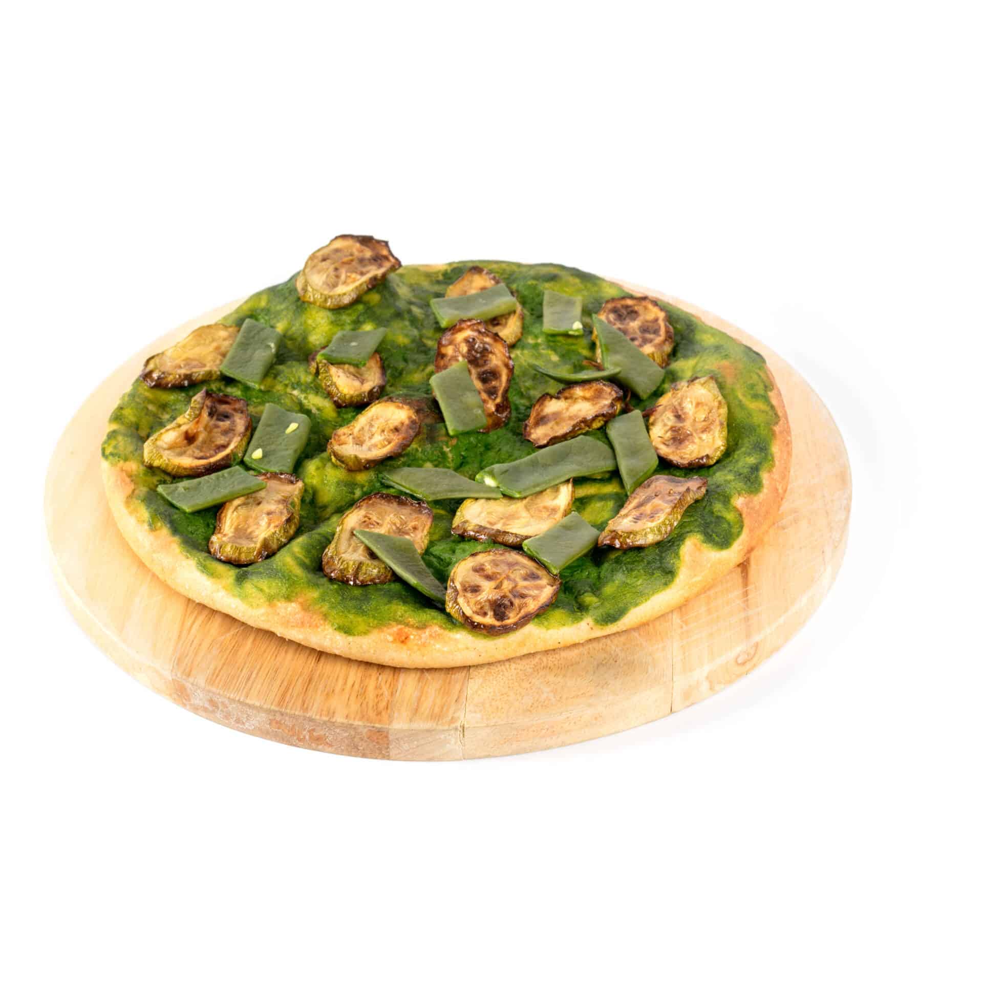 Pizza con crema di zucchini scuri, zucchini chiari, taccole, mozzarella di soia profumata al cipollotto